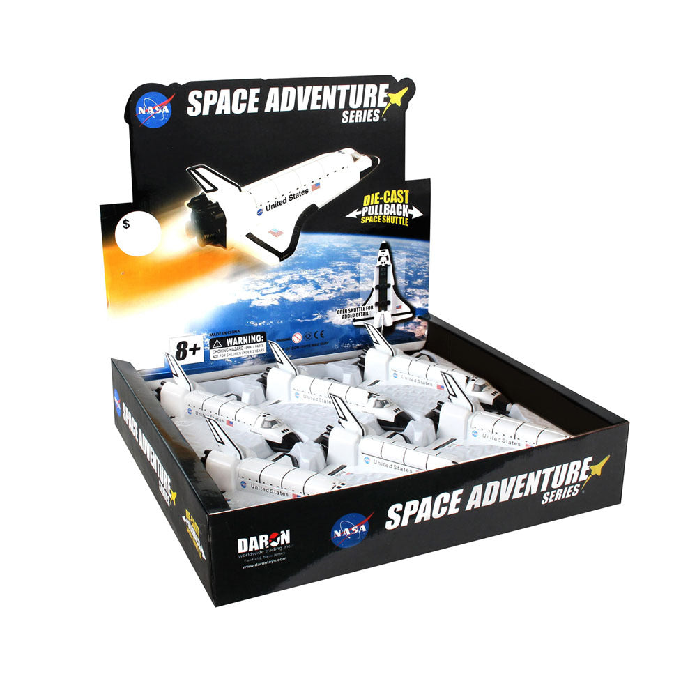 Die-cast metal space shuttle with pullback action. Shuttle doors open.