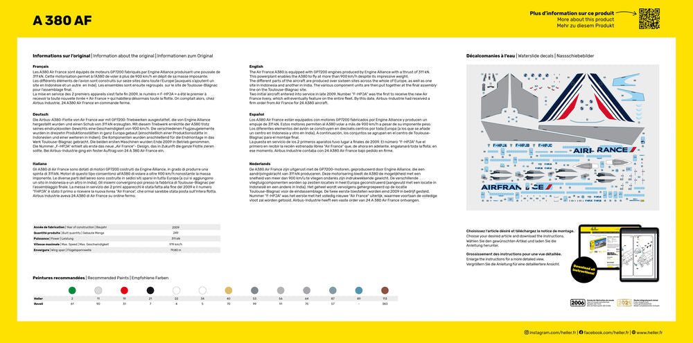 The Air France A380 is equipped with GP7200 engines produced by Engine Alliance with a thrust of 311 kN. This powerplant enables the A380 to fly at more than 900 km/h despite its impressive weight. The different parts of the aircraft are produced over sixteen sites across the whole of Europe, as well as one site in Indonesia and another in India. The various component units are then put together at the final assembly line on the Toulouse-Blagnac site. Two initial aircraft entered into service in late 2009. Number “F-HPJA” was the first to receive the new Air France livery, which will eventually feature on the entire fleet. By this date, Airbus-Industrie had received a firm order from Air France for 24 A380 aircraft.