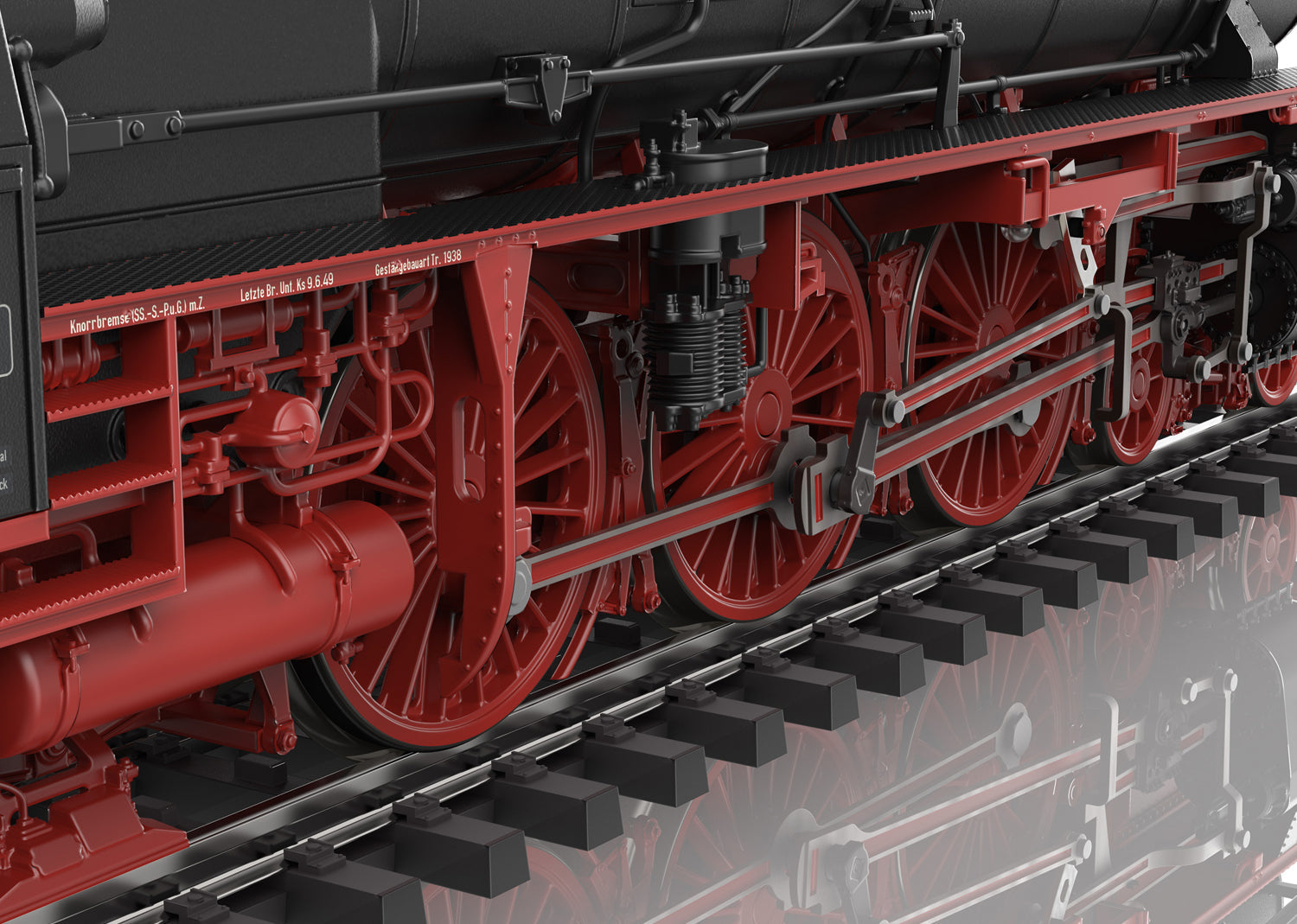 The locomotive has an mfx+ digital decoder and extensive sound functions. It also has controlled, high-efficiency propulsion with a flywheel, mounted in the boiler. 3 axles powered. Traction tires. The locomotive and tender are constructed mostly of metal. The locomotive has a factory-installed smoke unit, with speed-dependent dynamic smoke exhaust. Dual headlights, which change over with the direction of travel, will work in conventional operation and can be controlled digitally. The cab lighting, firebox flickering, and running gear lights can be controlled separately in digital operation. Maintenance-free, warm white and red LEDs are used for the lighting. There is a close coupling with a guide mechanism between the locomotive and tender. There is a close coupler with an NEM pocket and a guide mechanism on the tender. The buffer height on the locomotive and tender adheres to the NEM. The minimum radius for operation is 360 mm / 14-3/16". Piston rod protection sleeves and brake hoses are included.