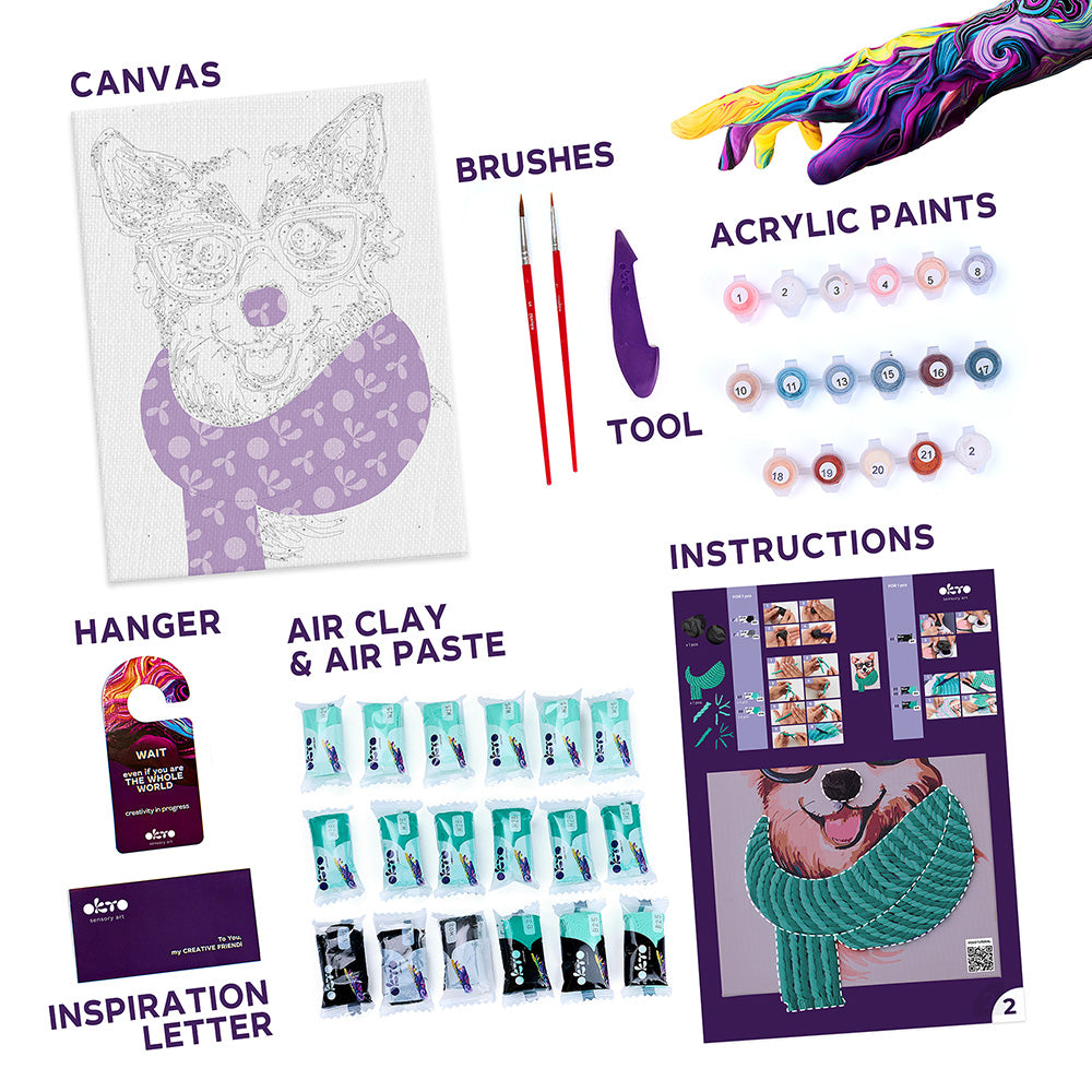 Paint your own corgi and add a 3D scarf made from air-dry clay.