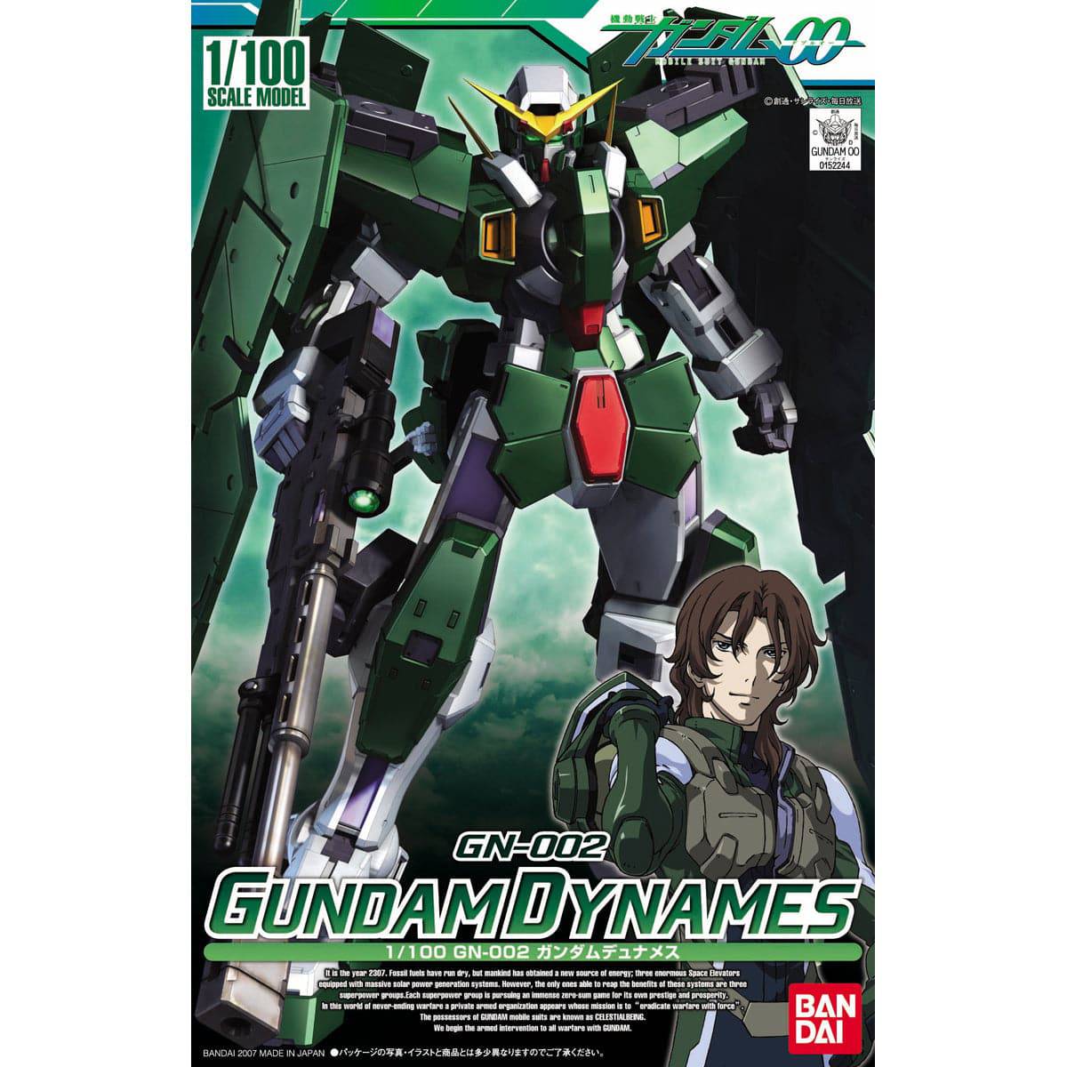 This second entry in Bandai's 1/100-scale, non-grade "Gundam 00" plastic kit series is the sharpshooter Gundam Dynames, as piloted by Lockon Stratos in the show. Sharply molded in color parts, Gundam Dynames will be fully poseable after completion with its polycap joints allowing for a wide range of dynamic poses. Features include foldable shoulder antennas, the antenna on its head that can slide down for gun camera mode, flexible GN shield, and a removable GN full shield attachment that can fold out to guard the Mobile Suit's front. Gundam Dynames is well armed with weaponry including a GN sniper rifle, twin GN beam pistols that can be stored in its holsters, and two GN beam sabers. Not a drop of glue or paint required (although painting will improve the finished results)! A sheet of foil stickers is included for detail along with a joint part for use with Bandai's Action Base 1 to set Gundam Dynames in mid-air poses.