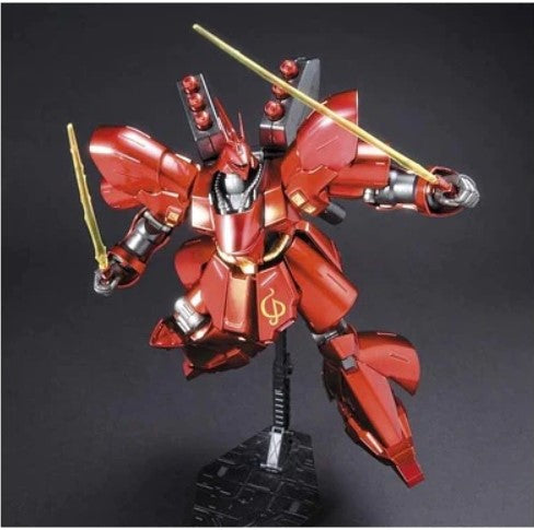 Last piloted by Char Aznable in "Char's Counterattack," the sizzlin' Sazabi now joins Bandai's HGUC series as a superbly detailed snap-fit plastic kit! Molded in a brilliant Metallic Coating color, the Sazabi will be fully poseable with polycap joints upon completion. Its features include a movable mono eye and openable funnel containers, and this Mobile Suit is fully equipped with 12 funnels (six in storage mode and six in deployed mode), a beam shot rifle, two beam sabers, a shield, and a beam tomahawk with two optional beam parts. Stickers for its mono eye and markings are provided.