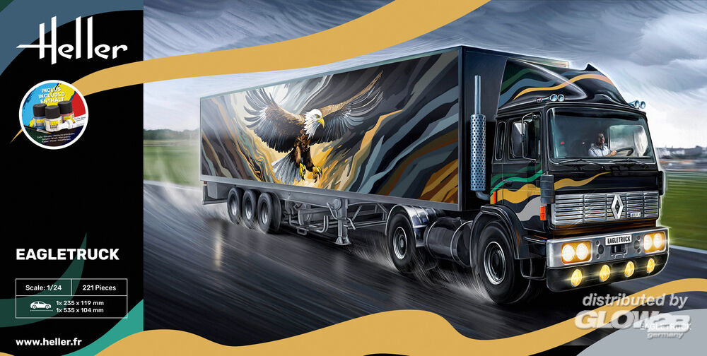 Included Cement · Brush · Main paints The Renault G260 is a powerhouse with its 6-cylinder in-line engine with 260 hp - a real king of the roads. In this Eagle Truck version, its powerful, black design with the impressive wings of the eagle gives it a striking appearance. The length of 18 meters in the original, or 770 mm as a model, is just as impressive as the eagle‘s wingspan. A design that combines the king of the skies and the king of the road.