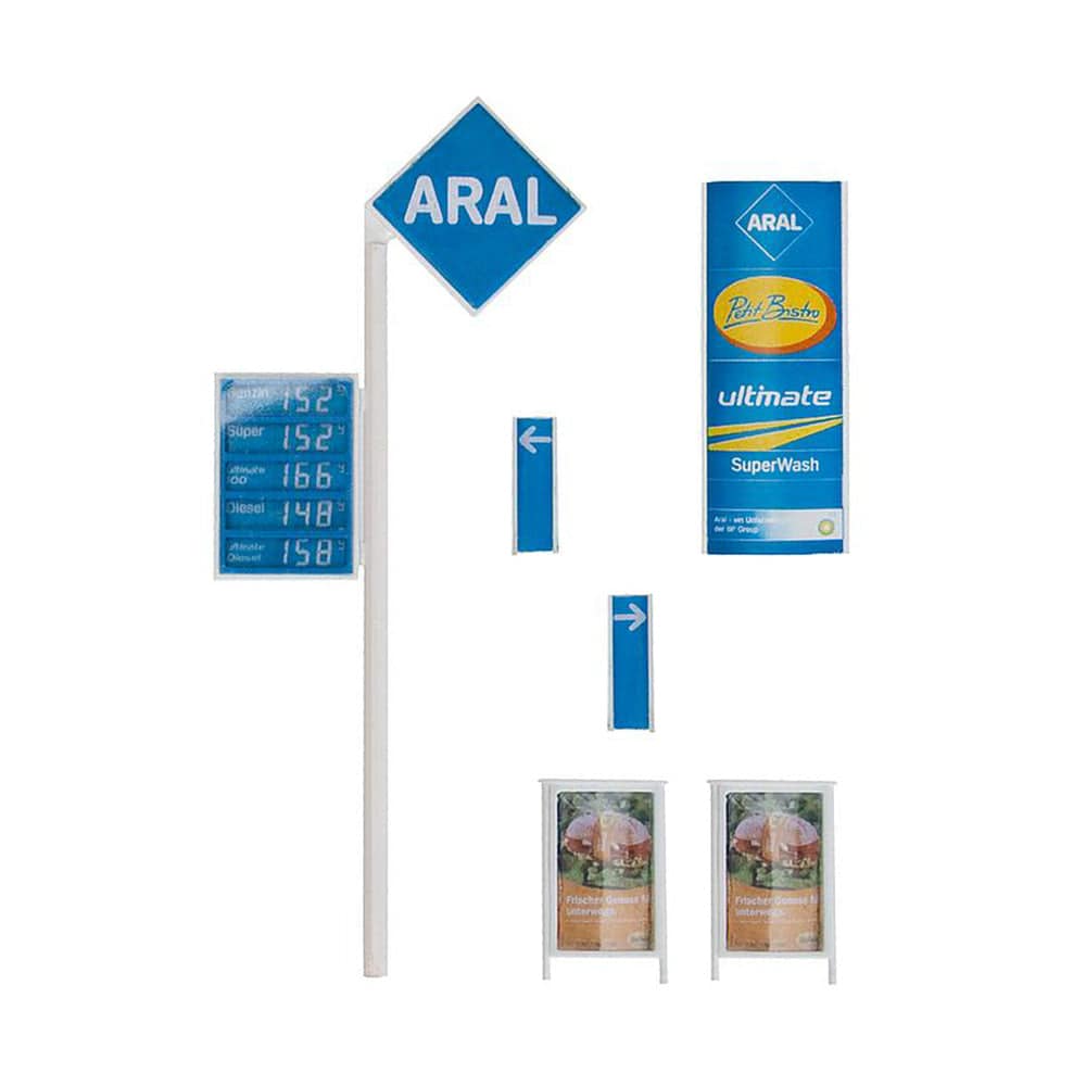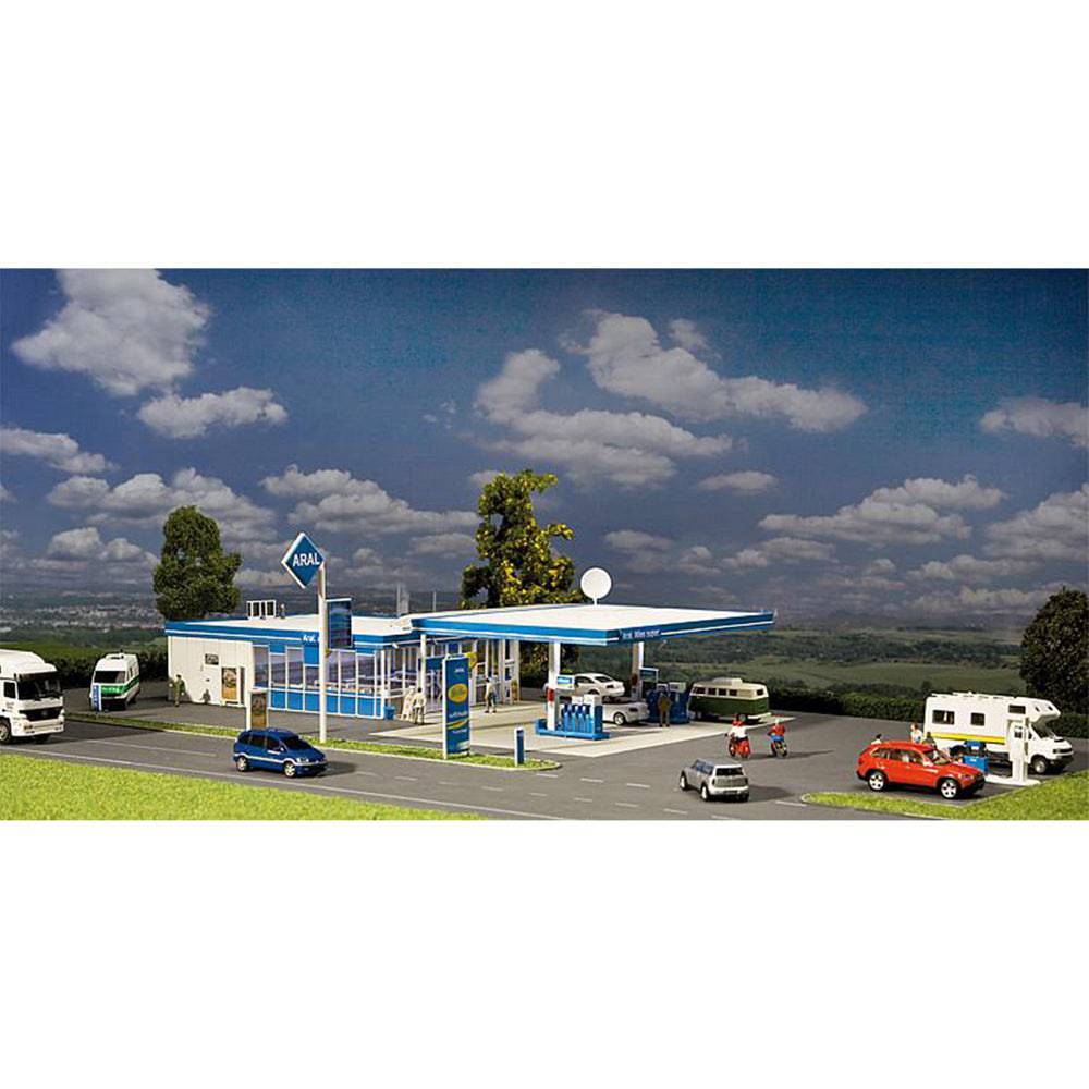 This Aral gas station from Faller 130482 is fully covered and contains a service station for air and water cleaning. In total there are four gas pumps that your residents can use to refuel their cars or trucks.