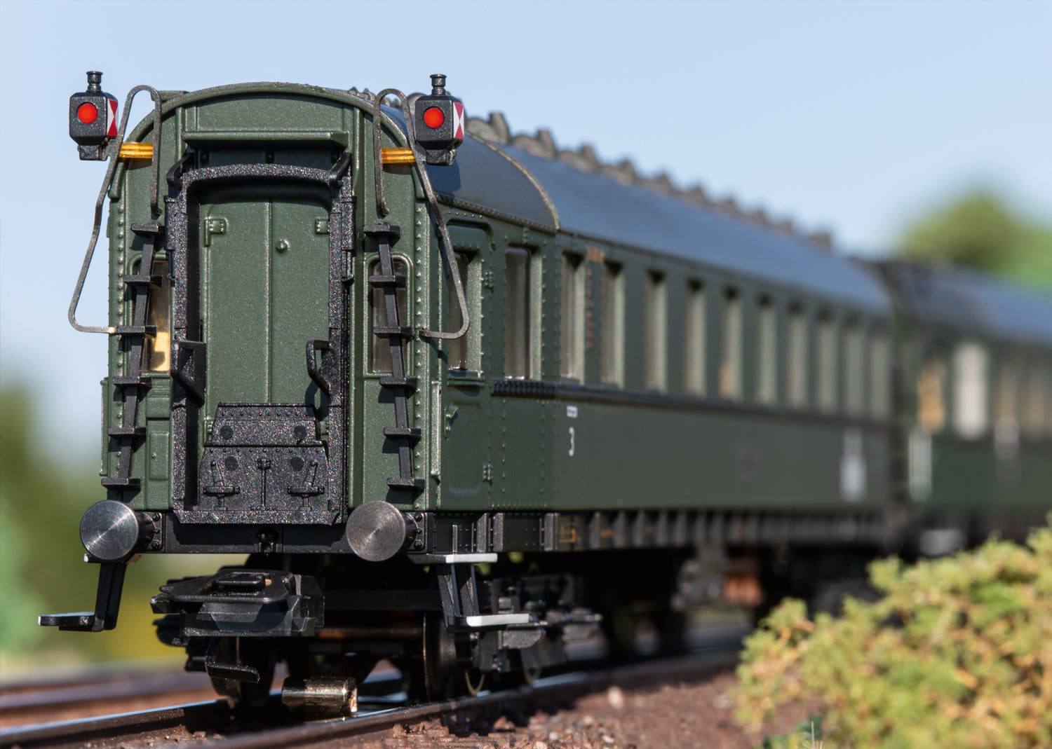 Model: The cars have detailed construction and are full-scale length. The cars have underbodies specific to the car types. The baggage car has Prussian standard design type V 4 trucks, and the coaches have "gooseneck" / Pennsylvania style trucks. All of the cars have factory-installed interior lighting with warm white LEDs. The brightness of the interior lighting for each car is adjustable. A buffer capacitor is built into each car to bridge short-term interruption of the current supply. One type C4ü coach has factory-installed marker lights and a pickup shoe. The marker lights light up prototypically in the direction of travel in a yellowish white and to the rear of the train in red. The entire car consist can be supplied with current by means of the factory-installed current-conducting close coupler heads. Each coach has 10 figures of passengers. There is a figure in the baggage car.
