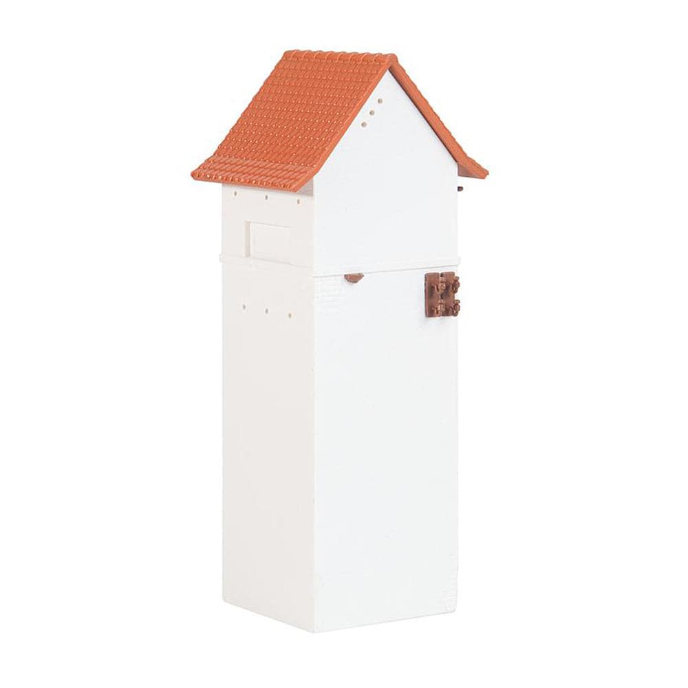 Caution, High voltage! Light-coloured substation tower with square base, double pitch roof and embedded steel girders with support insulators.