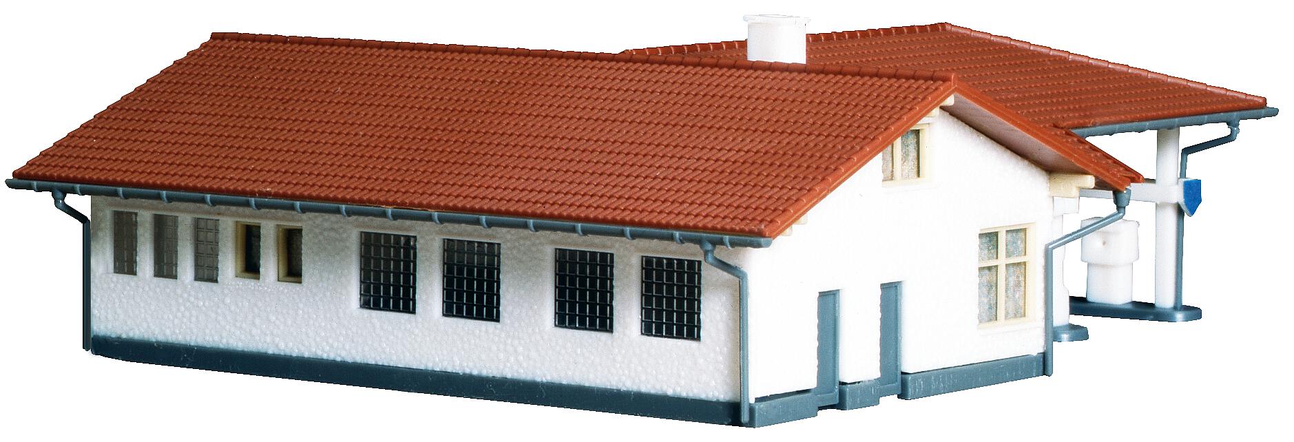 With sales room, pay desk and service bay. The pumps are covered by an overall roof. Decoration strips for several oil companies are included.