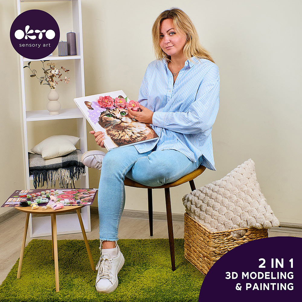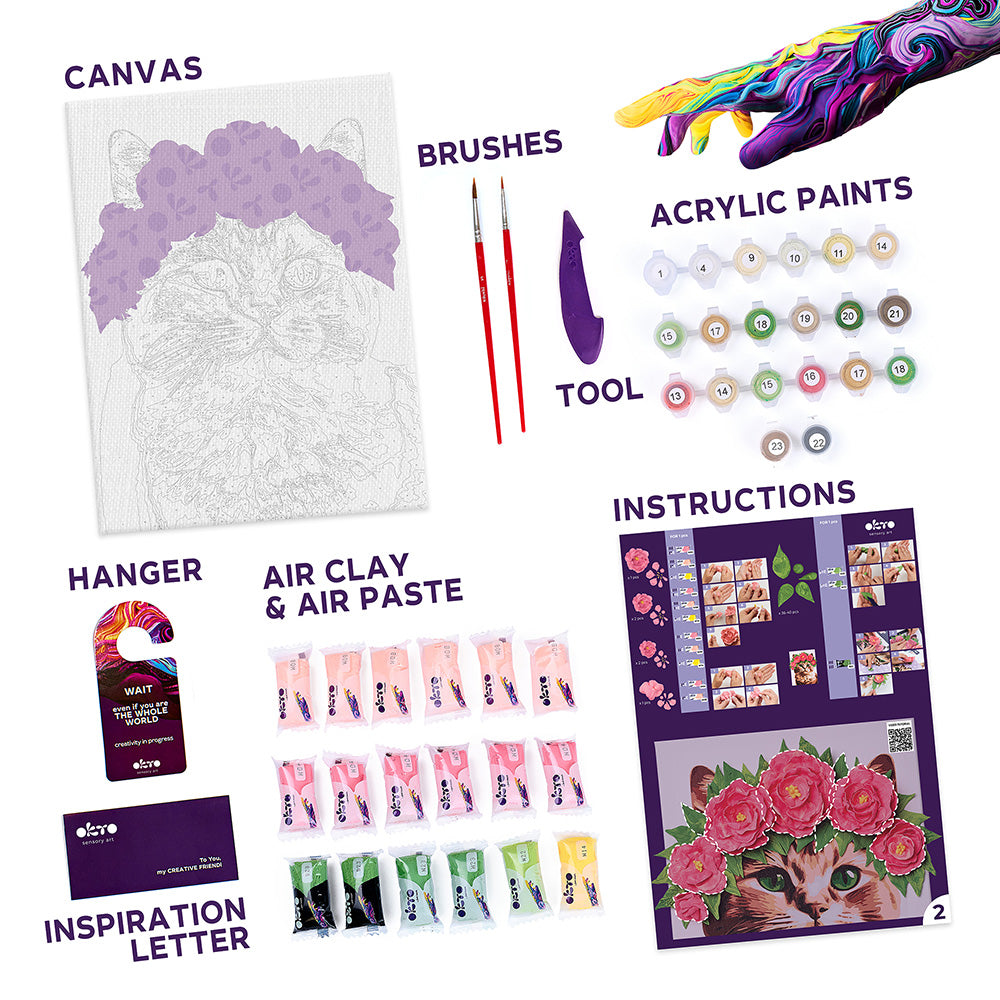 Paint a graceful cat with mesmerising green eyes, then add a 3D flower crown made of vibrant clay to complete the picture